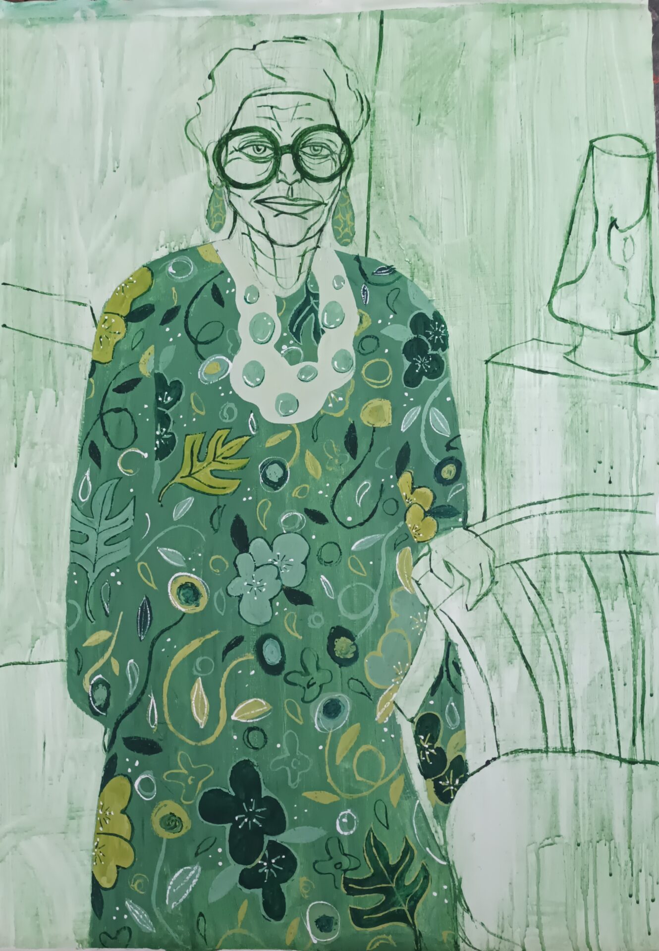 This artwork portrays an older woman standing confidently, dressed in a vivid, patterned green dress adorned with floral and botanical motifs. Her oversized glasses, bold earrings, and large circular necklace combine elements of nostalgia with a distinct contemporary sensibility. Although her clothing evokes the aesthetic of the 1970s, the design has been created in the present day, bridging past and present in a way that reflects how memory shape’s personal identity.